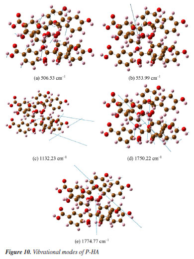 It is worth noting that the calculated peaks at 383.03, 1369.76 and 1483.68 cm-1 may correspond to the measured peaks at 396.59, 1358.96 and 1463.10 cm-1, respectively. The calculated peak at 1483.68 cm-1 may correspond to the measured peak at 1463.10 cm-1. It shows that the calculated values are somewhat different from the experimental values. This comparison demonstrates the importance of experimental validation in theoretical modeling as well as the general agreement between the two data sets, highlighting the effectiveness of DFT in predicting the vibrational modes of M-HA. Figure 7 presents the comparison of the experimental Raman spectra obtained for P-HA with the DFT simulated spectra of the P-HA cluster molecules. The correspondence between the calculated and measured peaks is shown in Table 3.