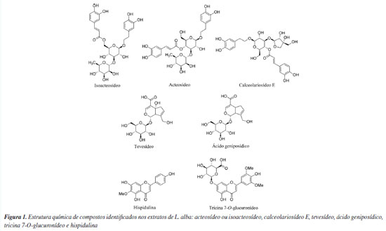 Fenilpropanoides, flavonoides e iridoides têm mostrado diversas atividades biológicas, incluindo atividades antioxidantes. O composto acteosídeo tem efeitos antioxidantes, anti-inflamatórios, neuroprotetoras, hepatoprotetoras, anticâncer e antidiabéticas relatados na literatura.42-44 A hispidulina demonstrou importantes atividades anticâncer, anti-inflamatória, tripanocida, leishmanicida e antiepiléptica.45-47 Iridoides demonstraram atividades biológicas promissoras, como propriedades antioxidantes, antitumorais, antifúngicas, antivirais, anticâncer, antidiabéticas, hepatoprotetoras, anti-inflamatórias, neuroprotetoras e antileishmania.48-51 Portanto, os perfis metabólitos encontrados nos extratos de L. alba demonstram o grande potencial biológico e econômico desta espécie.