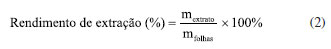 O intervalo das variáveis independentes estudadas (Tabela 1) foram determinadas com base em um planejamento experimental de fator único (Figuras 1Sa-1Sc, Material Suplementar). Todos os experimentos foram executados em ordem aleatória e três réplicas no ponto central foram utilizadas para a estimativa do erro experimental. A temperatura e o tempo de extração foram continuamente monitorados através do painel do equipamento. Para manter a temperatura do banho constante (± 1 ºC), quando necessário, pequenos volumes de água destilada foram retirados do banho e substituídos por volumes iguais de água destilada gelada. A relação entre as variáveis dependentes e independentes do PBB pôde ser explicada por uma função polinomial do segundo grau (Equação 1). ![]() em que Y corresponde a variável resposta medida; Xi e Xj (n entre 1 e 3) correspondem às variáveis independentes avaliadas no planejamento; β0 é uma constante; βi, βii, βij são os coeficientes de regressão do modelo: βi para os termos lineares; βii para os termos quadráticos; e βij para os termos de interação. Para os cálculos utilizados na determinação das condições ótimas de extração por EAU, considerando a maximização simultânea (utilizando a função de desejabilidade) do rendimento de extração e do TF das folhas da espécie estudada, foi adotada a seguinte consideração: todas as variáveis possuem igual importância, ou seja, mesmo fator de peso e impacto.22,23 Para a validação das condições de extração otimizadas, foram realizadas extrações em triplicata, empregando as condições ótimas preditas para as duas respostas simultaneamente. Extração por maceração A extração por maceração hidroetanólica foi realizada seguindo condições semelhantes às otimizadas no processo de ultrassom. Inicialmente, 0,5 g de material triturado foi colocado em um frasco de vidro cilíndrico (100 mL) com tampa e extraído com 35,5 mL de solução etanólica em água (29%, v/v) (mesma relação solvente para sólido da EAU, 71:1 mL g-1) a uma temperatura de 30 ºC durante 17 min e 48 s. As extrações foram realizadas em triplicata. Extração por infusão A extração por infusão foi realizada seguindo a metodologia descrita por Jesus et al.23 Inicialmente, 0,4 g de material triturado foi colocado em um béquer (25 mL) e extraído com 20 mL de água ultrapura aquecida a 92 ºC, em forno de micro-ondas (relação solvente para sólido de 50:1 mL g-1), e deixado em repouso durante 10 min a temperatura ambiente (26 ± 1 ºC). As extrações foram realizadas em triplicata. Tratamento dos extratos e rendimento de extração Todos os extratos obtidos foram filtrados sob pressão reduzida através de papel filtro para a remoção do particulado. Posteriormente, os extratos aquosos foram congelados em ultrafreezer a -80 ºC (Liotop UFR30, Liobras, São Carlos, SP, Brasil) e liofilizados a -58 ºC e pressão abaixo de 100 μHg (Liotop L101, Liobras, São Carlos, SP, Brasil) por 48 h para remoção do solvente aquoso. Os extratos hidroetanólicos foram submetidos a evaporação a pressão reduzida para a remoção do solvente orgânico a 45 ºC, congelados em ultrafreezer a -80 ºC e liofilizados a -58 ºC e pressão abaixo de 100 μHg, para a remoção do solvente aquoso remanescente. Todos os extratos brutos foram armazenados em potes de vidro fechados e estocados em freezer abaixo de -10 ºC ao abrigo da luz. Os rendimentos dos extratos foram calculados de acordo com a Equação 2: ![]() onde mextrato é a massa de extrato seco (em g) e mfolhas é a massa de folhas secas e trituradas (em g) utilizadas na extração. Teor de compostos fenólicos (TF) e teor de flavonoides (TFL) O TF dos extratos foi avaliado utilizando o reagente de Folin-Ciocalteu e TFL foi avaliado por meio da reação de complexação empregando tricloreto de alumínio hexa-hidratado (AlCl3.6H2O), ambos seguindo metodologias descritas por Jesus et al.23 O TF foi expresso como miligrama de equivalente de ácido gálico por grama de material vegetal seco (mg EAG g-1 ms), determinado a partir de uma curva de calibração (0-200 mg L-1, y = 0,0052x + 0,0739, coeficiente de determinação (R2) igual a 0,9977), e o TFL foi expresso como miligrama de equivalente de catequina por grama de material seco (mg EC g-1 ms), determinado a partir de uma curva de calibração (0-300 mg L-1, y = 0,0019x + 0,0528, R2 = 0,9975). Os experimentos foram realizados em triplicata e os resultados foram expressos como média ± desvio padrão. Ensaios antioxidantes Os ensaios de atividades antioxidantes [método de inibição do radical DPPH, método de inibição do radical ABTS e potencial redutor férrico (FRAP, do inglês, ferric-reducing antioxidant power)] foram realizados seguindo metodologias descritas por Jesus et al.23 A capacidade antioxidante de cada extrato foi expressa como micromol de equivalente de Trolox por grama de material vegetal seco (µmol ET g-1 ms) e determinada a partir de uma curva de calibração para cada metodologia (radical DPPH: 0-700 µmol L-1, y = -0,0019x + 1,7464, R2 = 0,9977; radical ABTS: 0-700 µmol L-1, y = -0,0010x + 0,7118, R2 = 0,9978; FRAP: 0-2000 µmol L-1, y = 0,0010x + 0,1550, R2 = 0,9974). Os experimentos foram realizados em triplicata e os resultados foram expressos como média ± desvio padrão. Análises por espectrometria de massas de alta resolução (FT-Orbitrap) As soluções dos extratos foram preparadas na concentração de 0,5 mg mL-1. Os extratos de EAU e maceração foram dissolvidos em solução hidroetanólica (50%, v/v), enquanto o extrato de infusão foi dissolvido em água deionizada. Os extratos solubilizados foram então centrifugados a 13.400 rpm por 5 min e os sobrenadantes foram transferidos para tubos Eppendorf. O processamento dos espectros de massas FT-Orbitrap e a atribuição das fórmulas moleculares foram realizados de acordo com Nascimento et al.14 Análises estatístic