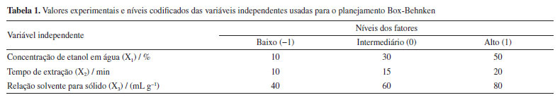 PARTE EXPERIMENTAL Reagentes Metanol (grau HPLC), etanol (grau analítico) e ácido fórmico (grau analítico, 85% v/v) foram comprados da Tedia (Fairfield, OH, EUA), Merck (Darmstadt, Alemanha) e Dinâmica (Indaiatuba, SP, Brasil), respectivamente. O reagente de Folin-Ciocalteu, 2,2-difenil-2-picrilhidrazil (DPPH), sal de diamônio 2,2'-azino-bis(ácido 3-etilbenzotiazolina-6-sulfônico) (ABTS) (Sigma-Aldrich, St. Louis, MO, EUA), 2,4,6-tris(2-piridil)-s-triazina (TPTZ), ácido gálico, catequina e ácido 6-hidroxi-2,5,7,8-tetrametilcroman-2carboxílico (Trolox) foram comprados da Sigma-Aldrich (St. Louis, MO, EUA). Todos os outros reagentes utilizados (tricloreto de alumínio hexa-hidratado, hidróxido de sódio, carbonato de sódio anidro, ácido clorídrico, acetato de sódio, nitrito de sódio, cloreto férrico hexa-hidratado e sulfato de ferro hepta-hidratado) foram de grau analítico ou superior. Água deionizada foi obtida a partir de um sistema Milli-Q (Millipore, São Paulo, Brasil). Material botânico Folhas da espécie L. alba (número de registro SisGen A8CCB3B) foram coletadas em abril de 2019 na Fazenda Experimental "Campus Rural da Universidade Federal de Sergipe (UFS)" onde foram cultivadas. Estas plantas pertencem ao Banco Ativo de Germoplasma de Plantas Medicinais e Aromáticas da UFS. Exsicata da espécie foi depositada no Herbário da UFS com número de registro 13466 (Departamento de Biologia, São Cristóvão, Sergipe, Brasil). Após a coleta, as folhas foram secas em estufa de circulação forçada (Modelo MA 035, Marconi, Piracicaba, SP, Brasil) a 40 ºC durante 50 h e trituradas em um processador comercial (Eletronic Pro 2 em 1, Britânia, Joinville, SC, Brasil). O material triturado foi classificado utilizando-se peneiras para análise granulométrica (Bertel, Caieiras, SP, Brasil) a um tamanho de partícula entre 35 e 60 mesh (segundo o sistema Tyler) e armazenado em frascos de vidro com tampa a temperatura ambiente. Extração por ultrassom e planejamento Box-Benhken A extração assistida por ultrassom foi realizada em um banho de ultrassom (Elma, Elmasonic P 60H, Alemanha) a uma frequência de 37 kHz (potência nominal de operação de 150 W) e temperatura de 30 ± 1 ºC. O material (0,5 g) foi colocado em um frasco de vidro cilíndrico (100 mL) com tampa e extraído de acordo com as condições de concentração de etanol em água, tempo de extração e relação solvente para sólido especificadas no planejamento BoxBenhken (PBB) utilizado com três variáveis e três níveis (Tabela 1): concentração de etanol em água (X1: 10, 30 e 50%, v/v), tempo de extração (X2: 10, 15 e 20 min) e relação solvente para sólido (X3: 40:1, 60:1 e 80:1 mL g-1).