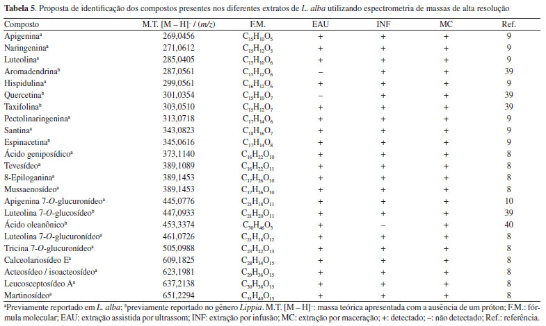 Através da Tabela 4 pode ser observado que os valores de rendimento, de TF e de TFL dos extratos L. alba foram influenciados pelos diferentes métodos de extração de acordo com suas respectivas condições experimentais, destacando o extrato EAU como aquele que apresentou os maiores valores destes três resultados em comparação aqueles da maceração e infusão. Em geral, esses resultados apresentados pelos extratos EAU em comparação as técnicas convencionais (Tabela 4) podem ser atribuídos, principalmente, ao efeito de cavitação acústica. Este efeito favorece a destruição da parede celular vegetal, facilitando assim a entrada do solvente na matriz e a liberação dos compostos em seu interior, intensificando, assim, a transferência de massa do processo de extração.7,27,30 Diversos estudos mostram que a EAU apresenta melhores resultados de recuperação em comparação a diferentes técnicas de extração.19,31-33 O extrato otimizado de EAU das folhas de Piperbetle, por exemplo, resultou em maiores valores de rendimento de extração, TF e TFL em comparação ao da maceração.19 O extrato obtido por EAU a partir de Punica granatum apresentou maior TF em comparação aos extratos obtidos por decocção e maceração a partir dessa espécie.31 Mašković et al.32 relataram o maior TF do extrato de EAU obtido de Lavatera thuringiaca quando comparado aos extratos de maceração, Soxhlet e MAE. Maiores resultados de TF e TFL do extrato preparado por EAU, em comparação aos de maceração e Soxhlet, também foram relatados em um estudo com as flores de Opuntia ficus-indica.33 Em um trabalho realizado por Iftikhar et al.,34 o extrato obtido a partir de Secale cereale por EAU apresentou maiores valores de TF e TFL em comparação ao extrato obtido por maceração convencional, empregando condições de extração semelhantes. Na Tabela 4 estão mostrados também os resultados antioxidantes (DPPH, ABTS e FRAP) apresentados pelos extratos de ultrassom, maceração e infusão. Observa-se que o extrato de L. alba obtido por EAU apresentou atividades antioxidantes significativamente maiores comparado aos extratos de maceração e infusão. Esses dados corroboram os resultados de TF e TFL desses extratos, observando-se uma correlação direta entre eles e os valores das atividades antioxidantes observadas.32,35 A forte correlação entre os valores de TF e/ou TFL e as atividades antioxidantes de extratos vegetais foi relatada anteriormente por diferentes autores.35-38 Em geral, diversos artigos têm relatado as vantagens da EAU em comparação às técnicas convencionais, que contribuem para a recuperação de compostos antioxidantes de matrizes vegetais.7,19,27,34 Brahmi et al.33 relataram as maiores atividades antioxidantes (FRAP e ABTS) apresentadas pelo extrato das flores da espécie Opuntia ficus-indica obtido por EAU em comparação ao extrato de Soxhlet. O extrato de Limonium sinuatum obtido por EAU apresentou maior atividade antioxidante (478,98 µmol ET g-1 ms) em comparação aos extratos de maceração (442,31 µmol ET g-1 ms) e Soxhlet (221,96 µmol ET g-1 ms).7 Iftikhar et al.34 relataram que o extrato de EAU obtido do farelo de centeio resultou em maior atividade antioxidante em comparação ao de maceração. De forma geral, os resultados fitoquímicos e antioxidantes apresentados pelo extrato preparado por EAU a partir das folhas de L. alba, mostram o potencial dessa espécie como uma importante fonte de compostos fenólicos bioativos. Apesar desses resultados, é importante mencionar que o extrato de EAU apresentou resultados de rendimento, TF, TFL e atividades antioxidantes menores em comparação aqueles obtidos através dos métodos de micro-ondas, decocção e Soxhlet relatados no estudo realizado por Jesus et al.9 com extratos de L. alba. Isso pode estar relacionado ao mecanismo envolvido na extração por micro-ondas, além do uso de temperaturas mais elevadas nesta técnica e nas técnicas de decocção e Soxhlet, podendo reduzir a viscosidade e a tensão superficial do solvente extrator e facilitar a sua penetração na matriz vegetal e a solubilização dos compostos químicos. Adicionalmente, o maior tempo de extração utilizado na extração por Soxhlet pode ter favorecido os melhores resultados apresentados por esta técnica em comparação ao extrato de EAU.9 Desta forma, este estudo fornece informações complementares e relevantes que ampliam o conhecimento sobre metodologias de extração utilizadas para a recuperação de compostos fenólicos das folhas de L. alba. Proposta de identificação dos compostos químicos presentes em diferentes extratos de L. alba As estruturas dos compostos presentes nos extratos de L. alba foram propostas com base nas análises por espectrometria de massas de alta resolução (FT-Orbitrap MS) por meio da infusão direta das amostras. Essa análises possibilitaram a obtenção das massas precisas dos principais íons negativos [M - H]- detectados nas amostras (Figura 4S, Material Suplementar), as quais foram convertidas em fórmulas moleculares.14 A Tabela 5 mostra as massas teóricas dos íons identificados em ordem crescente e as correspondentes fórmulas moleculares atribuídas.