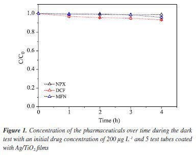 RESULTS AND DISCUSSION Optimization of the chromatographic conditions for the pharmaceutical analysis Initially, three stock solutions were prepared with a concentration of 100 mg L-1 of NPX, DCF, and MFN from their standards. An analytical curve was constructed for each stock solution using nine different concentrations. The working linear range for the three pharmaceuticals was established with the following concentrations: 10, 25, 50, 100, 200, 300, 400, 500, and 600 µg L-1, analyzed by HPLC to generate the calibration curves. The calibration curves were obtained using working solutions prepared in methanol. Figure 2S (Supplementary Material) presents the parameters of the analytical curves for the NSAIDs NPX (Figure 2Sa), DCF (Figure 2Sb), and MFN (Figure 2Sc), with respective linear equations: y = 3.0942x - 7.4359, y = 3.1538x + 25.287, and y = 5.5303x + 63.072. The analytical curves for the NSAIDs were satisfactory considering their respective coefficients of determination (R2): MFN (0.9996), NPX (0.9998), and DCF (0.9999), indicating good linearity and compliance with the guidelines for method validation.34,35 With these conditions, it was possible to determine the retention times for the pharmaceutical naproxen (5.2 min), diclofenac (8.9 min), and mefenamic acid (13.9 min), as well as their respective limits of detection (LOD): LODNPX = 2 µg L-1; LODDCF = 2 µg L-1; LODMFN = 4 µg L-1, and limits of quantification (LOQ): LOQNPX = 7 µg L-1; LOQDCF = 6 µg L-1; LOQMFN = 14 µg L-1. Verification of retention times of pharmaceuticals at pH 6 The optimized and validated chromatographic method by Silva et al.19 for NSAID analysis via HPLC was employed for studies on the drug extraction method at pH 2. In the analysis conducted in this work, the pH was not altered; that is, it was maintained at the value of Milli-Q water, pH 6. Due to this difference, analyses were performed using HPLC-UV-Vis at pH 6 to assess whether this variation in pH values would affect the chromatographic signals and retention times of the pharmaceuticals. The results showed that this pH variation in the solutions containing the pharmaceuticals did not produce significant changes in their retention times compared to the studies by Silva et al.,19 indicating that the chromatographic method used was effectively optimized for the studies throughout this work under the same conditions as those reported by the author. Study of adsorption on Ag/TiO2 films The dark test involves verifying the activity of the catalyst in the absence of irradiation, i.e., assessing whether the employed catalyst exhibits adsorptive properties for the studied compounds. In this experiment, initial concentrations of 200 μg L-1 for each of the three pharmaceuticals were used. The results shown in Figure 1 confirm that there was no significant change in the concentrations of NPX, DCF, and MFN over a period of 4 h.