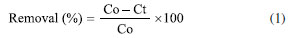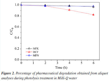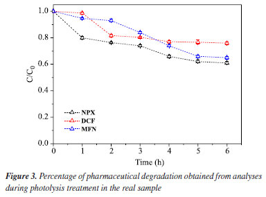 It can be observed in Table 2 that mefenamic acid exhibits almost the same reaction rate at both concentrations. The reaction rate of naproxen was nearly doubled at the lower concentration studied. The most significant result was observed with diclofenac, which showed an increase of up to three times in the value of the rate constant. Although these concentrations are still below those typically found in aquatic environments, these results demonstrate that Ag/TiO2 films are capable of degrading the pollutants studied. Physical-chemical and metal characterization of the real samples The seawater sample was collected on April 30, 2024, by Labciclos/DEOLI/UFMA. The quantification of water quality parameters; dissolved oxygen (DO), temperature, and pH, was performed in situ with the aid of a Hanna HI 98494 multiparameter probe. The following results were obtained: pH (7.35), Eh (oxidation-reduction potential (ORP), 53.5 mV), dissolved oxygen (DO) saturation (106.9%), salinity (5.42 PSU), temperature (28.42 ºC). According to National Council for the Environment (CONAMA) Resolution 357/2005,47 this water sample is classified as brackish water, indicated by the salinity concentration of 5.42 PSU, and categorized under water quality standards as class 1 brackish water, based on its pH, DO, and total dissolved solids (TDS) values. Such brackish waters can support fishing or cultivation of organisms for intensive consumption purposes. This sample has an Eh value (mV ORP) of 53.5, which refers to the oxidation-reduction potential measured in millivolts (mV). This value indicates the tendency of the solution to lose electrons, which is essential in chemical and biological processes. The positive Eh suggests an oxidizing environment. In brackish waters, mixtures of freshwater and seawater, the redox potential can vary due to chemical composition and interactions among ions present. The value of 53.5 suggests an environment conducive to certain biogeochemical reactions, influencing aquatic life and ecosystem health. Metal analysis was conducted at the Laboratory of Food, Beverage, and Environmental Analysis and Research at the Federal Institute of Maranhão, Monte Castelo Campus. The purpose was to identify the presence of metals Cu, Pb, Cd, Cr, and Ni in the sample to assess their activity and interference in photocatalytic processes. The analysis was performed using ICP-OES (inductively coupled plasma optical emission spectrometry) from PerkinElmer, model Optima 7000 DV. The working range was 5-1000 µg L-1; however, all metals were below the detection limit (LOD), and the concentrations observed are as follows: Cu (> LOD), Pb (> LOD), Cd (> LOD), Cr (> LOD), and Ni (> LOD). Determination of pharmaceuticals in the real sample using DLLME-SFOD In the laboratory, the water sample was subjected to the dispersive liquid-liquid microextraction with floating organic drop solidification (DLLME-SFOD) process, and subsequently analyzed using high-performance liquid chromatography (HPLC), following the method proposed by Silva et al.19 Diclofenac and naproxen were detected in the sample; however, it was not possible to observe an analytical signal for mefenamic acid. This occurs due to the low solubility of this pharmaceutical in water. Literature44,45 indicates that mefenamic acid tends to deposit at the bottom of seas, rivers, and oceans. Photolysis in purified water For the photolysis tests, the initial concentrations of the pharmaceuticals were 211 μg L-1 (NPX), 187.11 μg L-1 (DCF), and 202.34 μg L-1 (MFN). The results of this control test are shown in Figure 2, which presents the percentage of the pharmaceuticals concentrations remaining in the aqueous solution at different times during the photolysis treatment.
