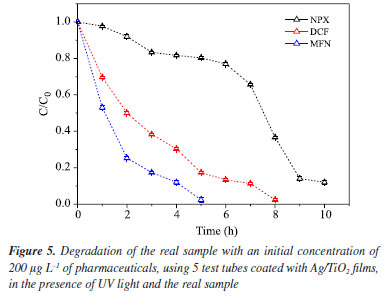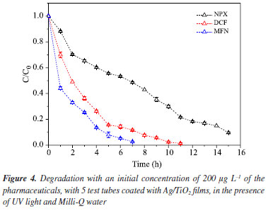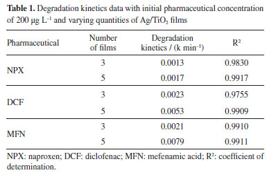 CONCLUSIONS In the tests that evaluate the increase in catalyst surface area, it was evident that the use of 5 immobilized films of Ag/TiO2, totalling 0.0220 m2 of area, yielded the best results in degrading the three pharmaceuticals. Comparing the action of the catalyst on the three pharmaceuticals in this study, it is possible to conclude that there is a radical preference for mefenamic acid, which after 7 h of degradation showed no further indication of the compound in the analysis performed by HPLC. Diclofenac degrades much more effectively at lower concentrations, specifically at 200 μg L-1 as used in this study. Meanwhile, naproxen and mefenamic acid exhibited similar behavior when degraded at both concentration ranges studied: 200 and 400 μg L-1. Mefenamic acid is easily degraded with a catalyst surface area of 0.0220 m2, which quadrupled its reaction rate compared to a surface area of 0.0132 m2. For the other two pharmaceuticals, the amount of catalyst did not significantly influence the reaction rate. Photolysis tests on real samples, although showing better results than in pure water, are still insufficient to fully degrade these compounds in an aqueous medium. After several hours of photolysis, stability was observed around 40% degradation for naproxen and mefenamic acid, and about 20% for diclofenac. Therefore, it is necessary to employ photocatalytic treatment using the Ag/TiO2 catalyst; with this approach, it was possible to degrade diclofenac in 7 h, mefenamic acid in 4 h, and achieve 90% degradation of naproxen in 10 h in the real sample.