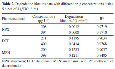 Therefore, by analyzing Figure 3S (Supplementary Material) and Table 1, it was observed that increasing the catalyst area for naproxen did not significantly enhance the reaction rate. In contrast, for diclofenac, the rate nearly doubled, and for mefenamic acid, it quadrupled. A similar result was obtained by Lima et al.,41 who used the same Ag/TiO2 films in their study, evaluating three different film areas: 0.0132, 0.0176, and 0.0220 m2. The results showed that the rate constants increased linearly with the increase in film area for various estrogens, reaching approximately 90% degradation of all three compounds. In summary, the behavior observed in this study for diclofenac was consistent with those findings. Influence of pharmaceutical concentration The pharmaceuticals concentrations studied were approximately 200 and 400 µg L-1, in order to evaluate the effect of catalysts at different concentrations. These concentrations are higher than those reported in other studies in the literature, such as Oliveira and co-authors,42 who confirmed a naproxen concentration of 75.90 µg L-1 in the Rio Monjolinho, SP, and Kramer et al.,43 who analyzed a diclofenac concentration of 0.285 µg L-1 in the Iguaçu River, Curitiba, PR, indicating higher levels in rivers. As for mefenamic acid, it was difficult to find data in the literature; despite numerous reports of its presence in domestic sewage, surface and groundwater, this compound is poorly soluble in water. Several authors44,45 have reported low solubility even under varying pH, temperature, and concentration conditions. The study of the influence of pharmaceutical concentration on the mixture showed that decreasing the diclofenac concentration positively affected its degradation, as observed in Figure 4S (Supplementary Material) and Table 2. However, for mefenamic acid and naproxen, increasing the concentration to double the initially tested amount resulted in almost no change in the reaction rate. Regarding naproxen, as expected, degradation remained low; after 7 h of treatment, only about 15% degradation was observed with doubling of the drug concentration. For diclofenac, this doubling caused a significant change: after 6 h, degradation was 90% at the lower concentration but only about 20% at an initial concentration of 400 µg L-1. This result can be attributed to the fact that at higher concentrations of compounds, there may be competition among transformation products within the reaction medium, slowing down the reaction rate.46
