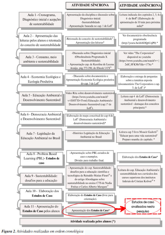 Na Figura 2, estão sistematizadas as atividades realizadas em ordem cronológica com indicação das ações desenvolvidas pelas professoras responsáveis pela disciplina e pelos estudantes. Outrossim, com a indicação de que se essas ações foram concretizadas de maneira síncrona ou assíncrona.