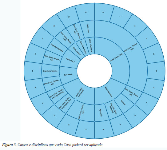 RESULTADOS E DISCUSSÕES Cursos e disciplinas A análise dos 16 EC produzidos pelos estudantes nos permitiu construir a Figura 3, que apresenta os cursos e disciplinas em que cada EC poderá ser utilizado, conforme indicação dos próprios estudantes. Para uma melhor visualização dos dados, a Figura 3 resume em quais disciplinas (disco interno) e em quais cursos (disco intermediário) os EC produzidos pelos alunos poderão ser aplicados (disco externo).
