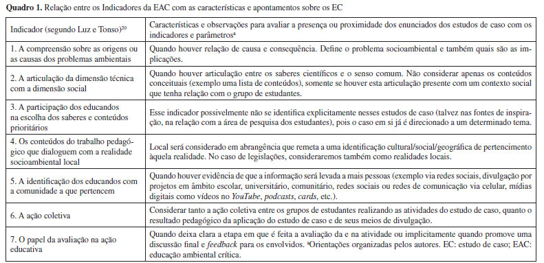 A atividade de apresentação e entrega dos EC elaborados ocorreu na aula 11, como ilustrado na Figura 2. Nas aulas 8 (Figura 2), de cada semestre da disciplina, as docentes embasaram os cursistas sobre a Problem Based Learning (PBL), com exemplos, o conceito e histórico do método, suas variações, além de esclarecerem sobre as estratégias para sua utilização no ensino de Química, assim como sobre o que se deveria levar em consideração para se elaborar um "bom" caso.3 De forma assíncrona, as professoras solicitaram a leitura de dois artigos: "O tema carboidratos através da metodologia de EC: desenvolvimento de conteúdos conceituais, procedimentais e atitudinais", de Passos et al.13 e "Argumentos elaborados sobre o tema "corrosão" por estudantes de um curso superior de Ciências", de Velloso et al.29 No final dessas aulas, foi requisitada a elaboração e apresentação de um enunciado de Caso para ser aplicado em um componente curricular do Ensino Superior, relacionado com as perspectivas ambientais trabalhadas na disciplina Sustentabilidade e Educação Ambiental. Para isso, os alunos de cada ciclo da disciplina foram divididos em grupos e apresentaram esses trabalhos solicitados na última aula de cada respectivo semestre letivo. Além do enunciado de EC com a especificação das características de um bom caso, os pós-graduandos detalharam as habilidades que o EC elaborado poderia desenvolver, assim como quais materiais de consulta seriam indicados para os futuros solucionadores dos casos, além de uma previsão de para qual curso e/ou disciplinas o enunciado poderia ser utilizado. Análise dos Casos Neste trabalho, foram analisados qualitativamente, por meio da Análise de Conteúdo (AC),30 os 16 EC produzidos e apresentados ao longo dos quatro semestres de oferecimento da disciplina. Para tanto, realizamos a leitura dos enunciados e indicações dos estudantes para quais cursos e disciplinas estes foram planejados, quais temáticas e conteúdos que objetivavam trabalhar, quais habilidades visavam desenvolver e materiais que seriam encaminhados para os futuros respondentes dos casos. Tais enunciados foram identificados como caso A até P e estão disponibilizadas na íntegra no link informado na seção "Declaração de Disponibilidade de Dados". Dessa forma, elaboramos as categorias a posteriori: "conteúdos e disciplinas"; "questões científicas e sociocientíficas"; e "habilidades", para contemplar a segunda questão de pesquisa (Quais seriam as habilidades, conceitos e temáticas relacionadas às problemáticas socioambientais contemporâneas que podem ser utilizadas para elaboração dos casos?) Na sequência, consideramos os sete Indicadores e Parâmetros da EAC determinados por Luz e Tonso,20 como categorias a priori, para responder à primeira questão de pesquisa (Elaborar enunciados de casos na disciplina Sustentabilidade e Educação Ambiental da pós-graduação pode favorecer o desenvolvimento dos princípios da Educação Ambiental Crítica?). Apresentamos um maior detalhamento sobre as etapas da análise de conteúdo no Material Suplementar (Figura 1S). Quanto aos Indicadores e Parâmetros da EAC presentes nesses estudos de casos, definimos algumas observações e características a serem consideradas para avaliar a presença ou proximidade dos EC com os Indicadores e Parâmetros de Luz e Tonso,20 conforme Quadro 1 e Quadro 1S (Material Suplementar).