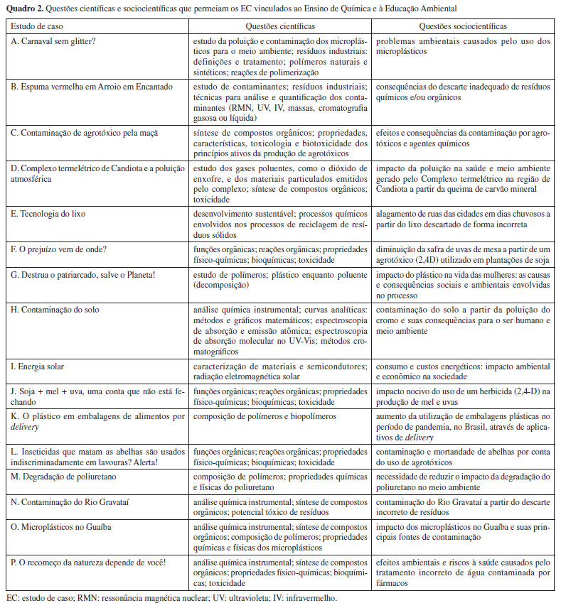 Referente às disciplinas em que os EC poderão ser aplicados (Figura 3), verificamos a indicação de uma variedade de disciplinas do Ensino Superior relacionadas aos cursos de Química, Engenharias, Nutrição e Agronomia. Esses dados são similares a estudos anteriores de Bernardi e Pazinato2 que constataram a gama de possibilidades de conteúdos e/ou temáticas nas diversas disciplinas relacionadas aos cursos de Química e áreas afins que podem ser abordadas pelo método de EC. Os estudos de caso (EC) C, D, K, M e O poderão ser direcionados para as disciplinas de Química Orgânica 2, Tecnologia Inorgânica, Introdução a Polímeros, Química Computacional e Química de Polímeros, respectivamente. Os EC J, L, N e O contemplaram a possibilidade de disciplinas relacionadas com Química Analítica Instrumental nas quais poderão ser trabalhados. Fato que pode ser explicado por quase um quarto dos participantes do estudo serem oriundos da Química Analítica como área de pesquisa (Figura 1). Quase metade dos EC (A, B, E, G, H, I e P) produzidos foram identificados como possíveis de serem abordados na disciplina de Introdução à Química Ambiental. Entendemos que os cursistas não puderam perceber que as questões ambientais podem e devem ser trabalhadas em várias disciplinas do Ensino Superior. Apenas o caso F contemplou essa possibilidade. Nessa linha de pensamento, concordamos com Leff,7 quando o autor argumenta que na universidade o Saber Ambiental precisa superar a fragmentação das disciplinas isoladas em Ciências Ambientais ou Educação Ambiental, e perpassar diferentes instâncias organizacionais e institucionais, para contemplar um conjunto de conhecimentos teóricos e práticos voltados para a reconstrução das interações entre sociedade e natureza. Para isso, é necessária a integração dos saberes e práticas das perspectivas ecológicas, econômicas, culturais e sociambientais às componentes curriculares dos cursos de graduação e/ou pós-graduação em Química. Essa é a compreensão de interdisciplinaridade de Leff,7 para que o Saber Ambiental seja efetivado, frente sua complexidade e visão holística e integradora de realidade sociocultural e socioambiental que necessitamos na atualidade. Todavia, existem fatores que dificultam a integração dessas perspectivas, como os limites decorrentes de condições estruturais das instituições de ensino superior, como a organização curricular e disciplinar do ensino, o oferecimento de disciplinas por diferentes institutos, departamentos e faculdades para um mesmo curso, sem que haja um diálogo integrador entre tais, a falta de formação continuada dos professores formadores quanto aos conhecimentos em questão etc. Assim, ao se considerar a ambientalização do currículo,17 é fundamental entender que não se trata apenas de incluir a temática ambiental nas ementas das disciplinas. Trata-se de um processo complexo, que demanda o engajamento e a articulação de todos os atores envolvidos. A ambientalização curricular17 é fortemente defendida na literatura, entretanto verificamos que os cursos de Química da instituição em questão ainda apresentam lacunas nesse sentido, conforme apontamentos de Slaviero e Pazinato.18 Apesar dos desafios existentes, é urgente transpor as barreiras disciplinares e incorporar, nos espaços pedagógicos e formativos, estratégias que aproximem a Química da Educação Ambiental Crítica, considerando a urgência das questões socioambientais. Assim, será possível avançar nas concepções e nas práticas formativas, promovendo transformações na formação dos futuros Químicos e pesquisadores, para que estes contribuam para superar os desafios socioambientais atuais e futuros. Questões científicas e sociocientíficas O Quadro 2 sintetiza as questões científicas e sociocientíficas presentes nos EC analisados. Percebemos uma multiplicidade de temáticas ambientais que os EC objetivam trabalhar. Destacamos que o estudo dos diferentes tipos de poluentes (Casos A, D e G) e o estudo de diferentes tipos de polímeros (A, G, K, M e O) foram as temáticas mais recorrentes. Outrossim, é pertinente destacarmos que os problemas socioambientais causados por agrotóxicos também se repetiram três vezes, como temática ambiental, nos Casos C, J e L (Quadro 2). Entendemos que essa repetição não demonstra a falta de temas a serem abordados, mas a importância que os estudantes atribuem a eles como potencial para a formação profissional dos estudantes dos cursos de Química e áreas afins.