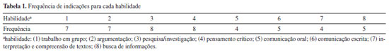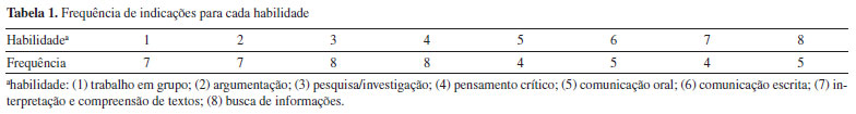 A título de exemplo, o caso denominado "Contaminação de agrotóxico pela maçã" aborda assuntos como efeitos e consequências da contaminação por agrotóxicos nos agricultores, trazendo como personagem principal o Sr. Carmelindo, produtor rural que, há aproximadamente dois meses após o início da colheita de 2019/2020, começou a sentir problemas de saúde, tendo sintomas como tonturas, diarreias, alergias de pele e vômitos. No final do enunciado, o cursista, como estudante de Química, deve apontar alternativas ao uso dos agrotóxicos para o Sr. Carmelindo. Desse modo, a narrativa abre perspectivas para a abordagem de problemas sociocientíficos causados por agrotóxicos. O uso excessivo de fertilizantes e agrotóxicos é defendido por grupos dominantes da área do agronegócio, com o intuito de aumentar a produtividade agrícola, no entanto os malefícios de tais práticas são catastróficos em âmbito socioambiental.6,11,12,31 Nesse sentido, não teremos Sustentabilidade sem a eliminação ou mitigação expressiva dessas substâncias químicas. Assim, a agricultura sustentável e a agroecologia devem ser cada vez mais difundidas e utilizadas na sociedade.31 Como alerta a pesquisadora Larissa Bombardi,31 o sistema capitalista transformou o setor agrícola em uma "máquina" de commodities e agroenergia, o que ocasiona a acentuação da miséria social e ecológica de muitos povos e territórios. O EC "O plástico em embalagens de alimentos por delivery", por sua vez, envolve assuntos como composição de polímeros e biopolímeros e abrange questões sociocientíficas. Isso por possibilitar discussões acerca dos problemas ambientais gerados a partir do aumento da utilização de embalagens plásticas no período de pandemia no Brasil, através de aplicativos de delivery. Nesse cenário, os alunos teriam que desenvolver um plástico biodegradável e defender o uso desse material em novas embalagens. A partir desses exemplos, consideramos que os EC associados às questões científicas e sociocientíficas podem possibilitar o desenvolvimento do posicionamento crítico, da argumentação e da tomada de consciência e dos princípios da EAC dos estudantes em qualquer nível de ensino, mas principalmente no contexto universitário e da pós-graduação em Química. Tendo em vista as características de uma metodologia investigativa como a do EC, percebemos que, no que concerne à Educação Ambiental, no ensino de Química, pode levar os acadêmicos a pensar, refletir, questionar por intermédio de uma situação problema,12 sobre as inter-relações entre as questões socioambientais, culturais, econômicas e políticas acerca de problemas ambientais que afetam o país e o mundo,9 para assim tomarem consciência dessas questões e desenvolverem o Saber Ambiental. Habilidades e atitudes As habilidades e atitudes que os estudantes indicaram que os enunciados podem contemplar estão descritas no Quadro 2S (Material Suplementar). Após a síntese dessas informações, foi construída a Tabela 1, relacionando a frequência de indicações para cada habilidade, utilizando-se a seguinte legenda numérica: (1) trabalho em grupo; (2) argumentação; (3) pesquisa/investigação; (4) pensamento crítico; (5) comunicação oral; (6) comunicação escrita; (7) interpretação e compreensão de textos; (8) busca de informações.