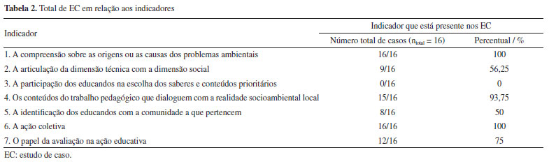 Analisando a Tabela 2, identificamos que os Indicadores 2 e 5 foram os menos contemplados dentre os 16 casos aqui analisados (56 e 50% respectivamente). Uma possível justificativa para uma baixa presença do Indicador 2 pode ser, segundo Marcondes et al.,35 o fato de que ainda é um desafio para professores a inserção da tecnologia e de questões ambientais em suas práticas pedagógicas devido a uma demanda de mais tempo e investimento na formação desses docentes. Já em relação ao Indicador 5, podemos atribuir que apenas metade dos casos foram contemplados devido a um histórico de formação conservadora dos professores, que, segundo Libâneo,36 se pauta na tendência da ênfase em técnicas e métodos, relegando, assim, conteúdos vinculados a um contexto social e de pertencimento com a sua comunidade.