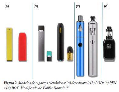 Quando e onde o cigarro eletrônico foi criado ainda está em debate, mas o desenvolvimento de dispositivos de geração de aerossóis de nicotina é realizado desde muito antes de seu sucesso para uso recreativo.23,91,92 O conceito de um dispositivo para inalar substâncias sem combustão surgiu no início do século XX, com Joseph Robinson93 patenteando o primeiro design conhecido em 1930, embora nunca tenha sido fabricado.93,94 Posteriormente, em 1963 (com concessão em 1965), Herbert A. Gilbert95 patenteou um "cigarro sem fumaça e sem tabaco" que produzia vapor, mas também não obteve sucesso comercial.95,96 Nos anos 70 e 80, Phil Ray e o Dr. Norman Jacobson conduziram pesquisas e criaram uma versão comercial que evaporava nicotina, sendo reconhecidos por cunhar o termo "vaping".94 O ponto de virada para o cigarro eletrônico moderno ocorreu em 2003, na China, quando o farmacêutico Hon Lik desenvolveu o primeiro dispositivo comercialmente bem-sucedido, utilizando um sistema de aquecimento elétrico para vaporizar e-líquidos contendo nicotina, sem a combustão do tabaco.95,97 Sua invenção foi comercializada na China em 2004 e começou a se expandir globalmente em 2006, levando à evolução dos dispositivos com diferentes designs, voltagens e métodos de entrega de nicotina, com e-líquidos tipicamente compostos por propilenoglicol, glicerina, flavorizantes e nicotina. De forma simplificada eles funcionam como vaporizadores portáteis, movidos à bateria, que produzem um aerossol pelo aquecimento da solução líquida, viscosa, contendo aditivos flavorizantes e nicotina, chamada e-liquid (trad. e-líquido, como será referido no texto, ou mesmo "suco" do inglês juice).86,91,92,97 Diferentes gerações de cigarros eletrônicos possuem caracteristicas cruciais, tais como estilos, possibilidades de modificações, tensão do elemento de aquecimento, possibilidade de reabastecimento, tipos e níveis de concentração de nicotina.61,86,91,92,97 As composições dos e-líquidos também variam, sendo as mais comuns as que contêm uma base com diferentes proporções de propilenoglicol (PG) e glicerina vegetal (GV), compondo 95% do líquido, e podendo conter aromas, nicotina e outros aditivos.24,98 Os e-cig são recomendados por autoridades de países como os participantes do Reino Unido como auxiliar na cessação do tabagismo.49,86 Nestes países, os cigarros eletrônicos são pontualmente considerados uma ferramenta de redução de danos, desde que usados exclusivamente por fumantes adultos, sob acompanhamento médico e com o objetivo de parar de fumar. No entanto, a exposição a algumas substâncias tóxicas pode ser menor em relação ao cigarro convencional (combustível), mas não inexistente. Estudos iniciais para avaliar seu uso terapêutico limitavam-se aos níveis de administração segura da nicotina, à ausência do alcatrão e eram focados em fumantes simples, com anamnese dos sintomas nos pacientes.23,26,99 Impulsionada pela internet, a propaganda de e-cig tornou-o rapidamente mais atratente e criou um nicho crescente de consumidores jovens e, na sua maioria, que nunca utilizaram cigarros convencionais. Importante frisar que não existem evidências suficientes comprovando sua utilização como auxiliar no tratamento do tabagismo, de fato alguns autores indicam que esses produtos apenas alteram o tipo de produto responsável que entrega a nicotina. No entanto, o uso de e-cig tem crescido entre pessoas mais jovens e levou vários governos a aplicar medidas visando controlar o acesso a cigarros eletrônicos.23,26 Esse cenário impõe a necessidade de estudos independentes que apontem os reais danos desses produtos a saúde, assim como sua caracterização química.76,99,100 Modelos O motivo pelo qual os cigarros eletrônicos se tornaram tão populares ao redor do mundo e tão rapidamente está ligado, em parte, ao seu aspecto moderno e personalizável. Diferentes modelos de cigarro eletrônico podem variar sua voltagem de operação (de 3 a 8 V), resistência do aquecedor (1 a 7 Ω), quantidade de e-líquido que armazena, características estéticas e novas formas de nicotina.18,68,84 Atualmente, os modelos de cigarros eletrônicos mais comercializados podem ser divididos em três categorias principais: Descartáveis, modelos que são preenchidos com líquidos, possuem funcionamento e composição idêntica de modelos não descartáveis (Figura 2a); os Pods (ou cartuchos), que são modelos não modificáveis que utilizam pequenos cartuchos (Pods), que devem ser substituídos quando completamente consumidos (Figura 2b); as pen (tradução: canetas, devido à sua aparência alongada, semelhante a uma caneta), que são modelos não modificáveis e possuem tanques recarregáveis, permitindo ao usuário adicionar diferentes e-líquidos, incluindo aqueles produzidos de forma caseira ou artesanal (Figura 2c); os BOX (tradução: caixa, denominados assim por sua estrutura mais robusta), que possuem tanques recarregáveis e a característica de poderem ser facilmente modificados, tanto no aspecto visual quanto na voltagem de funcionamento, sendo considerados mais modernos e de maior qualidade, principalmente pela possibilidade de personalizações (Figura 2d).