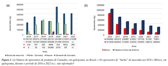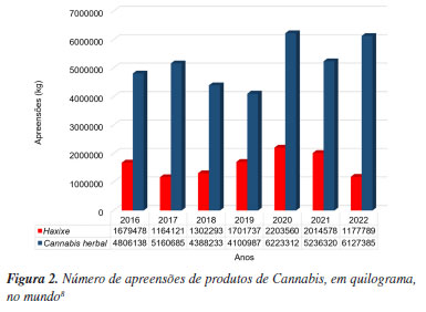 João Victor M. de AlmeidaI,II; Eclair Venturini FilhoIII; Nathália S. ConceiçãoI,II; Alan R. PereiraI,II; Julie M. M. FigueiredoIII; Ricardo M. KusterI; Hildegardo S. FrançaIII; Nayara A. dos SantosI,II,III; Wanderson RomãoI,II,III* I Departamento de Química, Universidade Federal do Espírito Santo, 29075-910 Vitória - ES, Brasil Recebido: 07/08/2025; *e-mail: wandersonromao@gmail.com Editor responsável pelo artigo: Jorge M. David Forensic chemistry plays a crucial role in criminal investigations, utilizing techniques to analyze evidence such as gunshot residues, explosives, and illicit drugs. Among these, Cannabis is widely studied due to its medical and recreational use, especially considering that it is the most trafficked drug worldwide. The plant contains over 700 compounds, including around 120 cannabinoids. Overall, cannabinoids have been used to treat several health problems such as chronic pain, nausea, and vomiting, among others. Despite its therapeutic potential, recreational use is associated with health risks, including cardiovascular issues, cognitive impairment, mental disorders, and addiction. The cannabinoids market has increased significantly along with interest in Cannabis products as a drug, leading to a need for novelty in instrumental analysis and methods to support quality control laboratories and scientific police forces. In this sense, the analysis of cannabinoids in various matrices primarily relies on chromatographic techniques. Gas chromatography (GC), often coupled with mass spectrometry (MS) or a flame ionization detector (FID), is widely used. However, liquid chromatography (LC) offers advantages in preserving acidic cannabinoids and preventing their degradation. Therefore, all the processes concerning Cannabis were addressed in this study, from its composition to legislation and chemical evaluation. INTRODUÇÃO A aplicação de procedimentos e técnicas analíticas na investigação criminal é de extrema importância na resolução de crimes, no apuramento de fatos e no levantamento de dados para a sustentação da ação criminal.1 Dentre os ramos das ciências forenses, a química forense, que teve seu início no final do século XVII, tem alta relevância e se baseia na aplicação de conhecimentos da química para a produção de provas materiais em prol da justiça.1 Suas aplicações incluem análise de resíduos de disparo, investigação de incêndios e explosivos, detecção de venenos, identificação de drogas e revelação de vestígios biológicos.2-4 Particularmente na análise de drogas, fármacos e substâncias psicoativas, diferentes técnicas possibilitam a identificação e quantificação dos princípios ativos analisados.3 Em geral, o uso dessas drogas tem como principais finalidades a busca pelos efeitos medicinais e/ou psicotrópicos, que interferem no sistema nervoso central (SNC). O uso dessas substâncias, lícitas ou ilícitas, está associado a impactos físicos, psicológicos e sociais.3,5 Uma das categorizações das drogas relaciona-se com sua ação principal no SNC, que pode ser: (i) depressora do SNC como o álcool, e opioides como heroína e morfina; (ii) estimulante do SNC, como as anfetaminas e cocaína; e (iii) perturbadora, como o LSD, e Δ9-tetraidrocanabinol (Δ9-THC).3,6,7 Dentre as drogas de abuso ilícitas, a maconha, produto da planta Cannabis, é mundialmente a mais utilizada, atingindo cerca de 2,5% da população mundial em 2018.6 Além da maconha, outros produtos comuns da Cannabis são o haxixe e o óleo de haxixe. Em relação aos efeitos dessa droga no usuário, em geral, se baseiam em distorções sensoriais e alterações na percepção da realidade.3,7 Devido o constante aumento no número de usuários, é possível observar um aumento do tráfico de drogas e suas apreensões.6 Dados da United Nations Office on Drugs and Crime (UNODC),8 indicam que, entre 2016 e 2022, apreensões de maconha em forma de "buchas" cresceram 77%, enquanto outras formas da planta apresentaram queda no mesmo período (Figura 1). Apreensões de buchas de maconha são significativas no Brasil e em outros países da América, como os Estados Unidos da América (EUA) e México, porém é possível observar a diminuição do mesmo entre os anos de 2016 e 2022, com queda de 71% nos EUA e de 91% no México.8 Em 2021, a Suprema Corte do México descriminalizou o uso recreativo privado de Cannabis por adultos, o que pôde ter influenciado o número de apreensões.9 Nos EUA, o cânhamo foi retirado da definição de maconha em 2018, fazendo com que o canabidiol (CBD) não seja considerado uma substância controlada. Em contrapartida, o uso de maconha no país não é permitido sob lei federal, e pode gerar penalidades para usuários. No entanto, é comum que estados do país tenham leis que permitem o uso medicinal e recreativo da maconha. Nesse sentido, 38 estados, Washington DC, Porto Rico, Guam e Ilhas Virgens Americanas permitem o uso medicinal de maconha, enquanto que 24 estados, Washington DC, Guam e as Ilhas Marianas Setentrionais aprovaram leis que permitem o uso recreativo da maconha.10 No aspecto global, as apreensões de produtos de haxixe declinaram em 2022 e os de Cannabis herbal aumentaram entre 2021 e 2022 (Figura 2).8