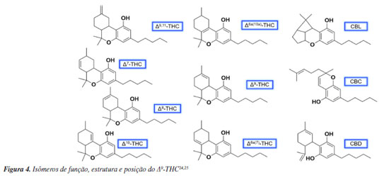Δ9-THC e seus isômeros O Δ9-THC (C21H30O2), massa molecular (MM) = 314,469 g mol−1, pKa = 10,6, (+)-(6aR,10aR)-6,6,9-trimethyl-3-pentyl-6a,7,8,10a-tetrahydro-6H-benzo[c]chromen-1-o, é o principal composto psicoativo, encontrado em maior concentração nas flores pistiladas (10-12%), seguido por folhas (1-2%), caule (0,1-0,3%) e raízes (< 0,03%).24 Além de ocorrer naturalmente, pode ser obtido por descarboxilação do Δ9-THCA ou por ciclização do CBD, processo também observado na planta.24 A concentração de Δ9-THC, contudo, decresce ao longo do tempo, devido à conversão em CBN.24 O Δ9-THC possui 4 estereoisômeros: (-)-Δ9-trans-THC, (+)-Δ9-trans-THC, (-)-Δ9-cis-THC e (+)-Δ9-cis-THC. Dentre esses, o (-)-Δ9-trans-THC é o que está presente de forma mais abundante na planta e é o principal composto com propriedades psicoativas da Cannabis. Quando se trata da composição e quantidade de diferentes canabinoides presentes na planta, os canabinoides Δ9-THC, CBD e CBC são os principais constituintes, sendo que 95% deles podem ser encontrados na sua forma ácida em amostra de biomassa.24 Ademais, o Δ9-THC possui cinco isômeros principais, sendo eles Δ8-trans-THC, CBL, CBD, CBC e CBD (Figura 4).24,25