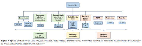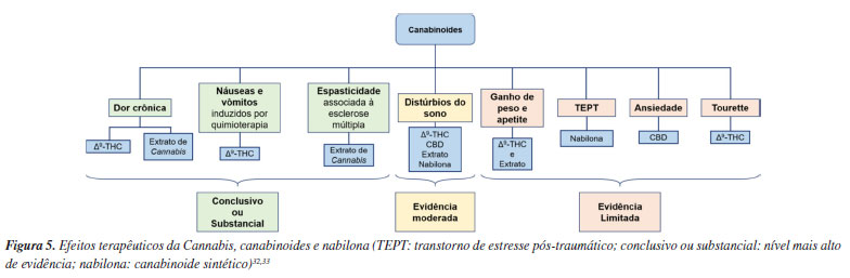 APLICAÇÕES TERAPÊUTICAS Uso recreativo e riscos O consumo recreativo de Cannabis está associado a uma série de efeitos adversos. Relatos incluem problemas cardiovasculares em jovens saudáveis, além de ansiedade, paranoia, disforia, comprometimento cognitivo e complicações gestacionais, como baixo peso ao nascer.26 O uso crônico tem sido relacionado a alterações estruturais e funcionais do cérebro, aumento do risco de acidente vascular cerebral, câncer respiratório e de testículo, além de anedonia e dependência.26 Estudos epidemiológicos também apontam associação com sintomas psicóticos e esquizofrenia, especialmente entre usuários frequentes.26-28 Aproximadamente 10% dos consumidores desenvolvem dependência, e casos de síndrome de hiperêmese por canabinoides vêm sendo descritos.27,28 Há ainda riscos relacionados ao fumo passivo: evidências preliminares indicam a presença de metabólitos de Δ9-THC em pessoas expostas à fumaça de segunda mão.29 Potencial terapêutico Apesar dos riscos, estudos recentes apontam benefícios terapêuticos do uso controlado de canabinoides. O CBD, isolado ou em combinação com Δ9-THC, tem sido empregado no manejo de epilepsia, dor crônica, ansiedade, depressão, esclerose múltipla e insônia (Figura 5).30-33 No entanto, a eficácia de muitas dessas aplicações ainda carece de confirmação robusta: grande parte dos ensaios clínicos é composta por amostras reduzidas e de curta duração, o que limita a avaliação de efeitos a longo prazo.34-36