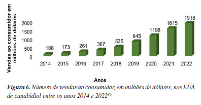 Questões como tolerância, dependência e interações medicamentosas permanecem insuficientemente esclarecidas. Há relatos de uso em crianças com transtorno de déficit de atenção e outros distúrbios de neurodesenvolvimento, embora faltem evidências conclusivas sobre a segurança.31,34-37 Mercado e regulamentação Nos Estados Unidos, onde o cânhamo foi legalizado em 2018, o mercado de CBD apresenta rápido crescimento: projeções indicam faturamento global próximo de 105 bilhões de dólares até 2026.30‑35,38 Segundo a Statista,39 entre 2022 e 2024 houve um aumento de 1.810 bilhões de dólares obtidos na venda de produtos de CBD (Figura 6). No Brasil, a Anvisa reportou a venda de 13 milhões de produtos derivados de Cannabis para uso medicinal em 2021.30,31,34,35,38 Estimativas de 2023 apontam 430 mil pacientes em tratamento, sendo a maioria por importação, seguida por farmácias e associações.40