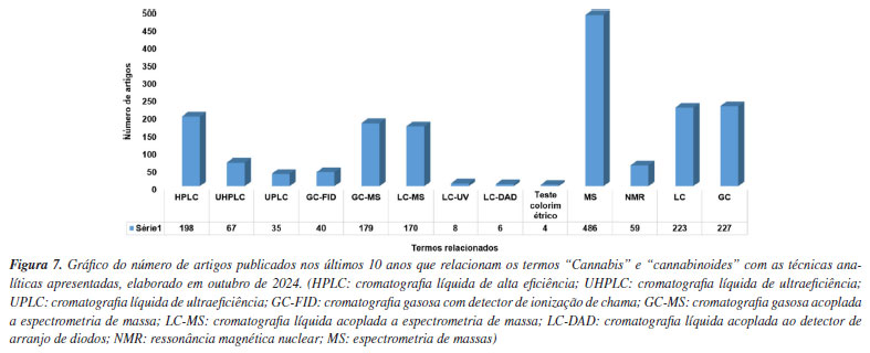ANÁLISE DE CANABINOIDES A quantificação de canabinoides em diferentes matrizes é realizada principalmente por cromatografia líquida (LC) e cromatografia a gás (GC), associadas ao analisador espectrometria de massas (MS) ou detectores de técnicas espectofotométricas ou ionização em chama (FID).53,54 Dentre as técnicas cromatograficas, a LC apresenta vantagem na análise de canabinoides ácidos, pois evita a descarboxilação observada na GC devido às altas temperaturas.54 Uma análise bibliométrica realizada a partir do Web of Science, com os termos "Cannabis" e "cannabinoids" associados a técnicas analíticas, mostra a predominância de LC-MS e GC-MS na última década (Figura 7). Esse resultado reflete a elevada sensibilidade da MS e a importância das etapas cromatográficas para a separação de isômeros, especialmente relevantes para aplicações em química medicinal.