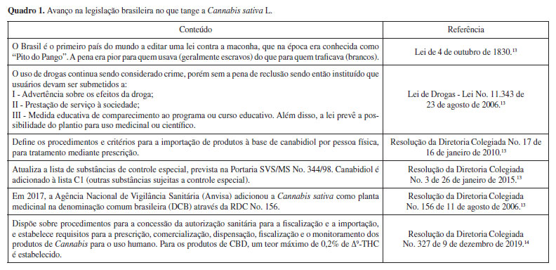 No Brasil, a Lei No. 11.343 de 2006,5 instituiu o Sistema Nacional de Políticas Públicas sobre Drogas, que trata de diversos assuntos relacionados ao uso de drogas e seu tráfico, e define os crimes relacionados. Nesse sentido, a Lei classifica como drogas, substâncias ou produtos capazes de causar dependência, especificados ou relacionados em listas atualizadas periodicamente pelo Poder Executivo da União. Além disso, conforme o Art. 2º,5 em todo o território nacional, são proibidos, o plantio, a cultura, a colheita e a extração de compostos a partir de substratos vegetais com objetivo de produzir drogas, com algumas exceções regidas na lei. Como penalidade, a exportação, importação, a produção, e o fornecimento de droga, mesmo de forma gratuita, acarretam ao infrator à reclusão de 5 a 15 anos com o pagamento de R$ 500,00 a 1500,00 dias-multa.5 No entanto, sobre o uso medicinal de produtos medicinais contendo canabinoides, a Resolução da Diretoria Colegiada No. 327 de 2019,11 regulamenta a comercialização desses produtos, permitindo a venda, sob prescrição médica e com retenção de receita de canabidiol (CBD) e Δ9-THC, e indicando-os para prescrição somente se outras opções de tratamento existentes não obtiveram o resultado esperado. Ademais, o uso desses canabinoides é regulamentado para tratamento de problemas de saúde específicos, com indicação do uso de Δ9-THC acima de 0,2% em condições clínicas irreversíveis ou em cuidados paliativos.11 No caso de uso medicinal pessoal, a Resolução da Diretoria Colegiada No. 355 de 2020,12 estabelece critérios e procedimentos para importação de produtos de Cannabis por pessoas físicas. Em síntese, a legislação relacionada à Cannabis apresenta histórico extenso e tem evoluído progressivamente ao longo dos anos (Quadro 1).