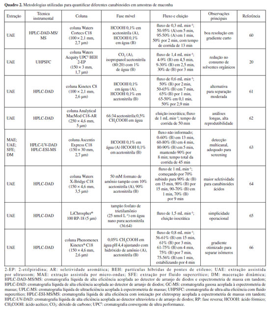 Nesse sentido, considerando as principais técnicas utilizadas, uma revisão de metodologias desenvolvidas com LC foi realizada, a fim de detalhar o processo de análise de maconha (Quadro 2).