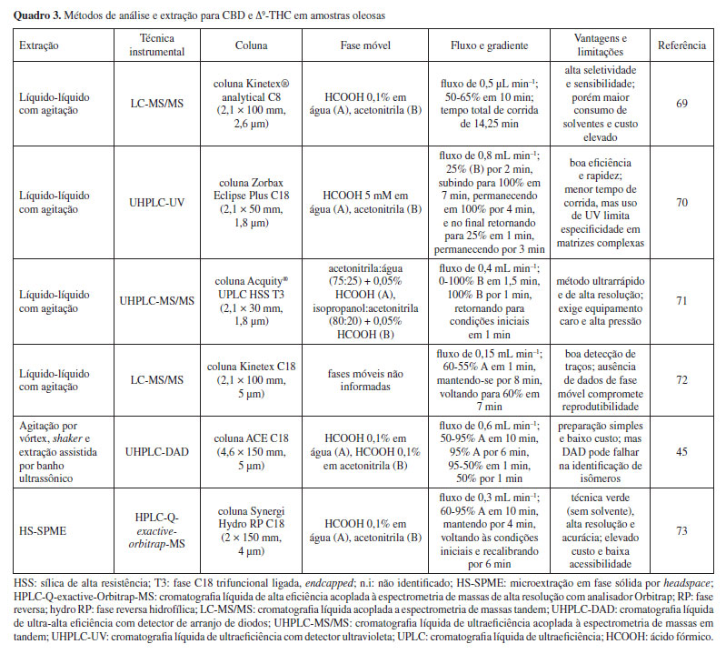 Apesar do avanço de tecnologias como cromatografia líquida de ultraeficiência (UPLC) e cromatografia líquida de ultraeficiência (UHPLC), a cromatografia líquida de alta eficiência (HPLC) permanece como a técnica mais empregada para a análise de canabinoides.20,24,61-67 Essa predominância se deve, em parte, à maior disponibilidade instrumental e à robustez metodológica, embora esteja associada ao consumo elevado de solventes (fluxos acima de 1 mL min-1) e consequente maior geração de resíduos. A UHPLC, por sua vez, apresenta vantagens como maior resolução e menor tempo de análise, mas exige operação em pressões elevadas e otimização cuidadosa do gradiente, da temperatura e do volume de solvente.67,68 A complexidade da matriz de Cannabis impõe a necessidade de separar adequadamente canabinoides estruturalmente similares, sobretudo isômeros. A escolha da fase móvel e do gradiente de eluição influencia diretamente a resolução obtida. Trabalhos recentes45,69 indicam o uso predominante de soluções de ácido fórmico (0,1%) ou ácido acético em água como fase aquosa, combinadas com acetonitrila acidificada como fase orgânica. Tempos de corrida variam amplamente (de menos de 10 até mais de 40 min), sendo ajustados conforme o conjunto de analitos-alvo.67 Em relação às colunas, observa-se a predominância de C18, atribuída à sua maior capacidade de interação hidrofóbica e consequente aumento da resolução cromatográfica. Essa característica favorece a separação de isômeros, cujo fracionamento é particularmente desafiador. Recentemente, colunas C8 também têm sido utilizadas, demonstrando potencial para maior seletividade em gradientes otimizados.65 Ainda assim, há espaço para exploração de colunas alternativas, como C30 e hilic, que podem ampliar a seletividade em metodologias pouco exploradas. No preparo de amostras, destaca-se o uso de extração assistida por ultrassom (UAE), frequentemente associada à HPLC. Essa técnica tem se mostrado eficiente ao reduzir tempo de extração e consumo de solventes, além de aumentar o rendimento em comparação com métodos tradicionais como maceração, extração assistida por micro-ondas e extração com fluido supercrítico.20,24,60-67 No entanto, para estudos cujo objetivo é o fracionamento completo dos constituintes da planta, a maceração continua sendo indicada. Apesar da variedade de abordagens cromatográficas descritas na literatura para a análise de canabinoides em matrizes oleosas, observa-se que o número de métodos validados permanece reduzido. Além disso, grande parte dos protocolos disponíveis encontra-se depositada sob a forma de patentes, desenvolvidos pelos próprios fabricantes, o que limita o acesso a metodologias independentes e comparáveis.44,45 Considerando a relevância do tema, apresenta-se no Quadro 3 um panorama de metodologias recentes baseadas em LC para a análise de amostras oleosas contendo CBD e Δ9-THC.