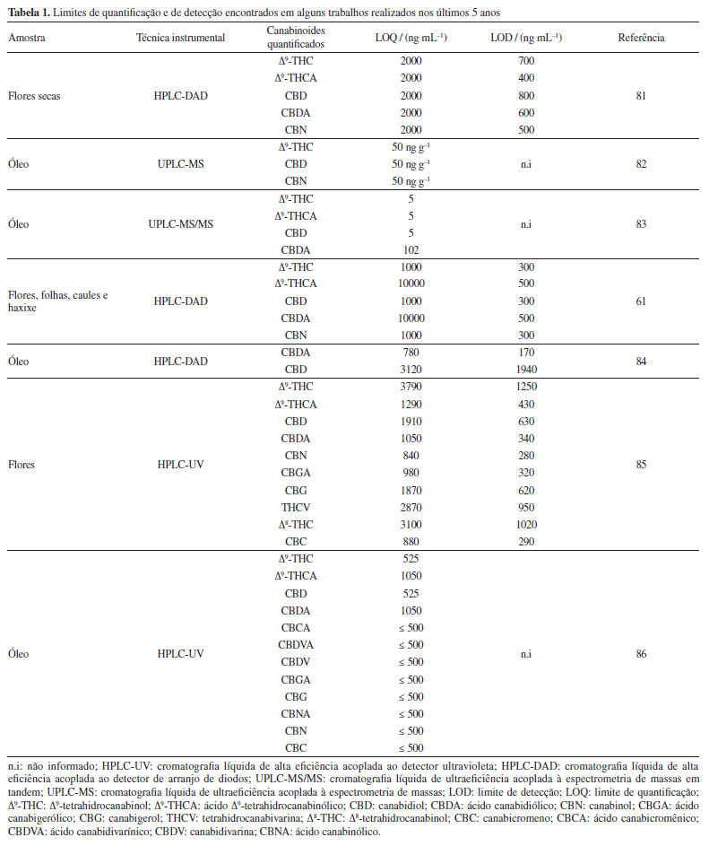 VALIDAÇÃO ANALÍTICA A validação de métodos analíticos é etapa essencial no desenvolvimento de metodologias, pois permite comprovar a qualidade e a adequação do método para o propósito a que se destina. No Brasil, a Resolução da Diretoria Colegiada (RDC) No. 166 de 2017,74 da Anvisa e o DOQ-CGCRE-008,75 do Inmetro definem critérios e procedimentos de validação, harmonizados com documentos internacionais.76,77 Segundo o DOQ-CGCRE-008,75 as figuras de mérito incluem seletividade, linearidade (faixa de trabalho e faixa linear), sensibilidade, limites de detecção (LOD) e quantificação (LOQ), exatidão (tendência/recuperação), precisão e robustez. Para métodos quantitativos, todos os parâmetros, exceto a robustez, são obrigatórios; já em métodos qualitativos, apenas seletividade e LOD são requeridos.74-80 Nos últimos cinco anos, diversos trabalhos reportaram a validação ou verificação de métodos para a quantificação de canabinoides em diferentes matrizes. A Tabela 1 sintetiza valores de LOD e LOQ obtidos em estudos recentes,81-86 permitindo comparar a sensibilidade de distintas técnicas cromatográficas e detectores.